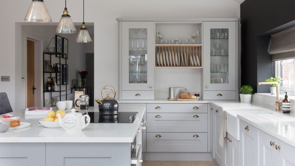 What makes these kitchens inviting is the display of everyday items. Open shelving showcases white dishes and glass jars filled with pantry staples. Copper pots hang from racks, creating both function and visual warmth.