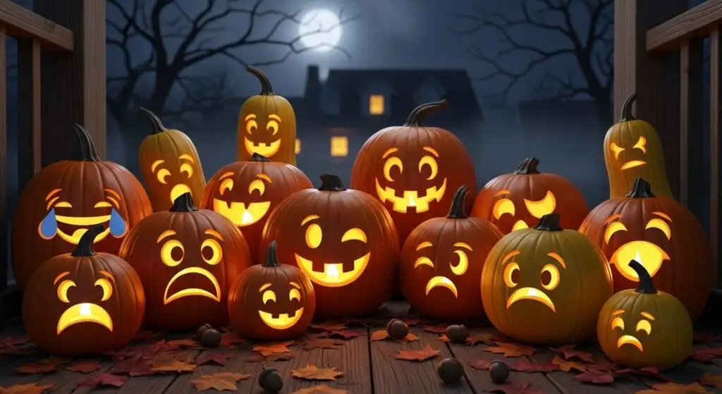 Modern emoji expressions including laughing face, heart eyes, or smile bring contemporary humor to pumpkin carving traditions. The bold, simplified features of emoji designs translate well to carved pumpkins and appeal to younger generations. Simple shapes make these patterns surprisingly easy to execute cleanly.