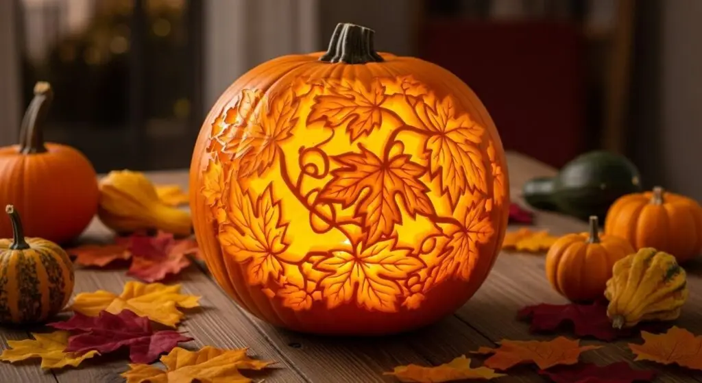 Carved maple or oak leaf patterns offer elegant alternatives to traditional scary designs. The natural autumn theme integrates seamlessly with fall decor and creates sophisticated warm glow when lit. This design extends seasonal relevance beyond Halloween into Thanksgiving displays.