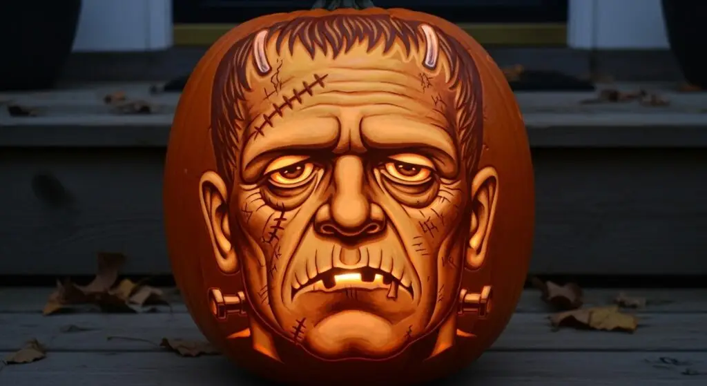 Flat-top head, neck bolts, and forehead stitches make Frankenstein’s monster instantly identifiable. This classic horror character works excellently in multi-pumpkin monster displays. The straightforward features make it accessible to intermediate carvers.
